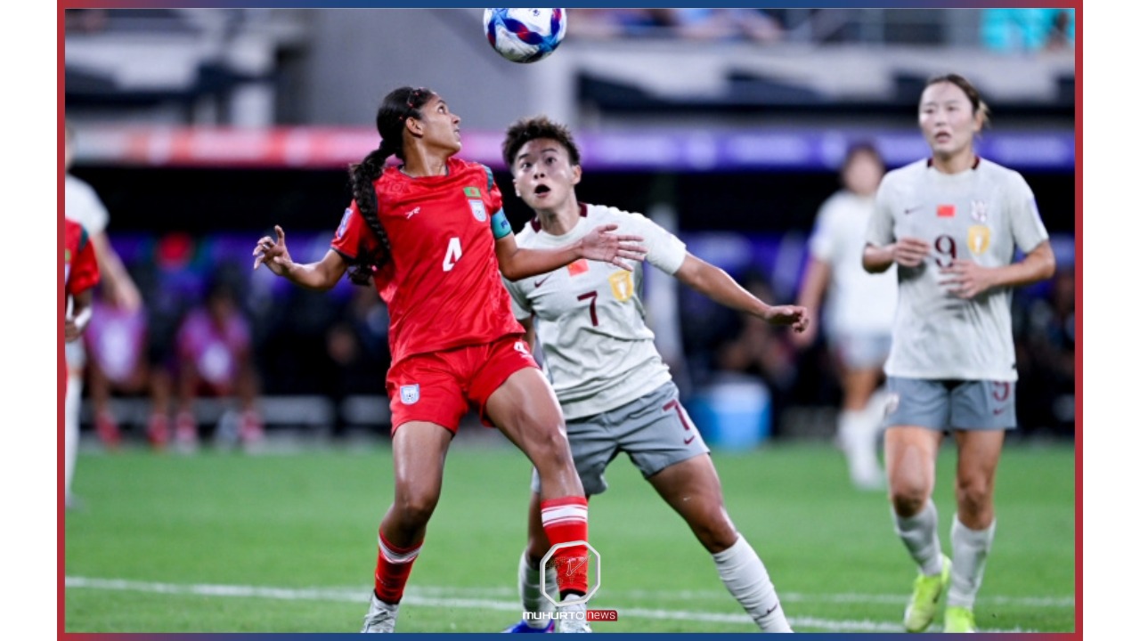 ম্যাচের শুরু থেকেই রক্ষণাত্মক কৌশলে খেলতে থাকে বাংলাদেশ। ১১ মিনিটে গোলরক্ষক মিলি আক্তার একটি নিশ্চিত গোল প্রতিহত করেন। ১৪ মিনিটে পাল্টা আক্রমণে গিয়ে ঋতুপর্ণা চাকমা দূরপাল্লার এক শট নিলেও তা চীনের গোলরক্ষক রুখে দেন। ম্যাচের ২৪ মিনিটে ওয়াং শুয়াংয়ের একটি গোল অফসাইডের কারণে ভিএআরে (VAR) বাতিল হয়। তবে প্রথমার্ধের শেষ দিকে ৪৪ মিনিটে ওয়াং শুয়াং এবং এক মিনিট পরেই যাং রুই গোল করলে ২-০ ব্যবধানে এগিয়ে যায় চীন।