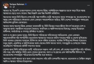 মা জনসেবা, ত্যাগ ও সংগ্রামের অবিস্মরণীয় ইতিহাস রেখে গেছেন: তারেক রহমান